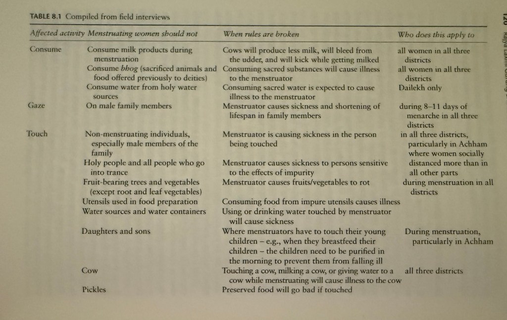 Resistance to comply would anger the family members, village elders, and most importantly the Dhami who could be a man or a woman. Based on the interviews conducted the Brahman Chhetri group were most likely to strictly follow the rules of chhaupadi but the other groups including the lower caste women were involved too. The 3rd generation of women in the household look down upon their grand-daughters for having a more loose/laid back approach towards the rules as that applies to everyone. The Nepali government has made a law criminalising the chhaupadi practice, societal pressure refuses a change. “This newly amended law has been in force since September 2018. The law stipulates that if people who observe chhaupadi are reported, they can be sentenced to three months in jail and a fine of NRs. 3,000 (Adhikari 2020).”
