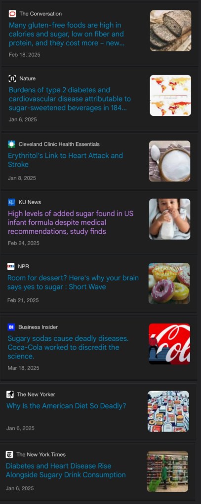 Extras: https://theconversation.com/many-gluten-free-foods-are-high-in-calories-and-sugar-low-on-fiber-and-protein-and-they-cost-more-new-research-247165, https://www.nature.com/articles/s41591-024-03345-4, https://health.clevelandclinic.org/erythritol, https://news.ku.edu/news/article/report-reveals-high-levels-of-added-sugar-in-us-infant-formula-despite-medical-recommendations, https://www.npr.org/2025/02/21/1232862552/sugar-desserts-brain-craving-science, https://www.businessinsider.com/coca-cola-misled-america-about-soda-science-sweet-deadly-book-2025-3, https://www.newyorker.com/magazine/2025/01/13/why-is-the-american-diet-so-deadly, https://www.nytimes.com/2025/01/06/health/sugary-soda-beverages-diabetes-heart-disease.html