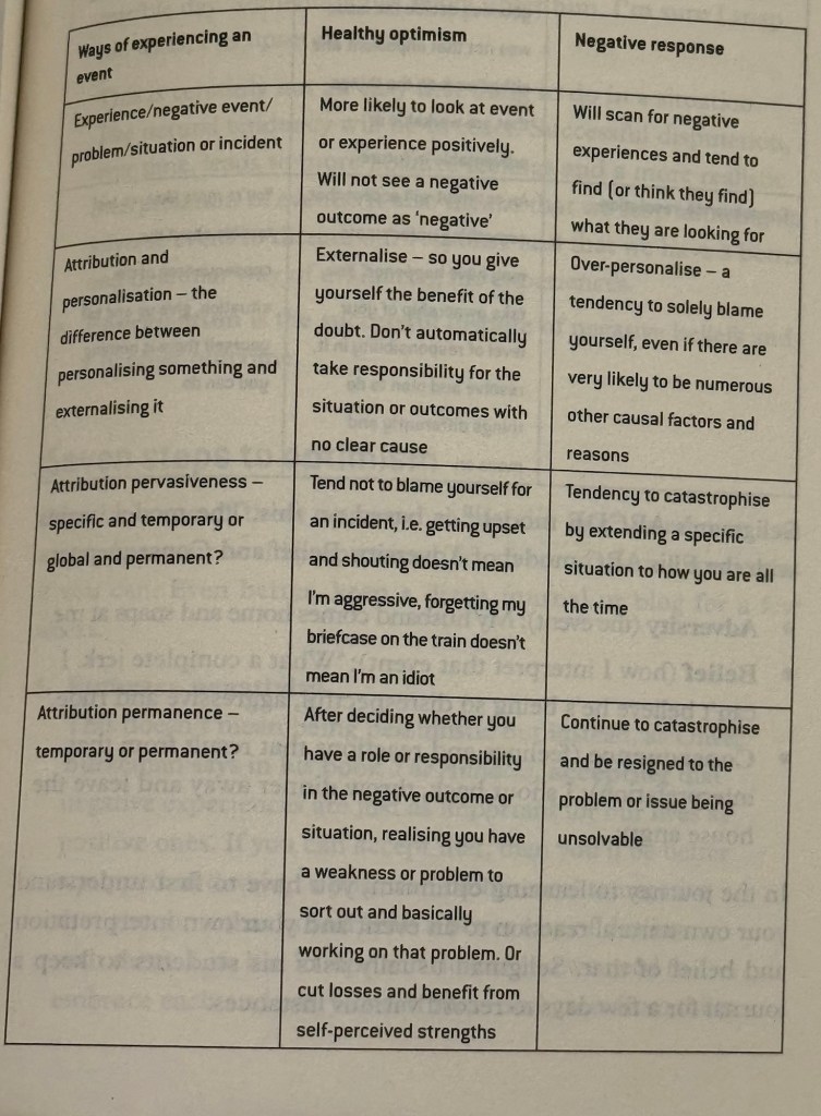 - Seeing problems as temporary and not pervasive. Being able to acknowledge your own role within a situation, feelings and actions. Less blame laid on self or external factors.