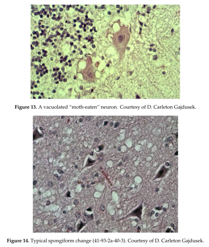 •Interestingly, the significance of vacuolar changes was not appreciated by Klatzo et al., but “small spongy spaces” were noted in seven of 13 cases studied by Beck and Daniel.