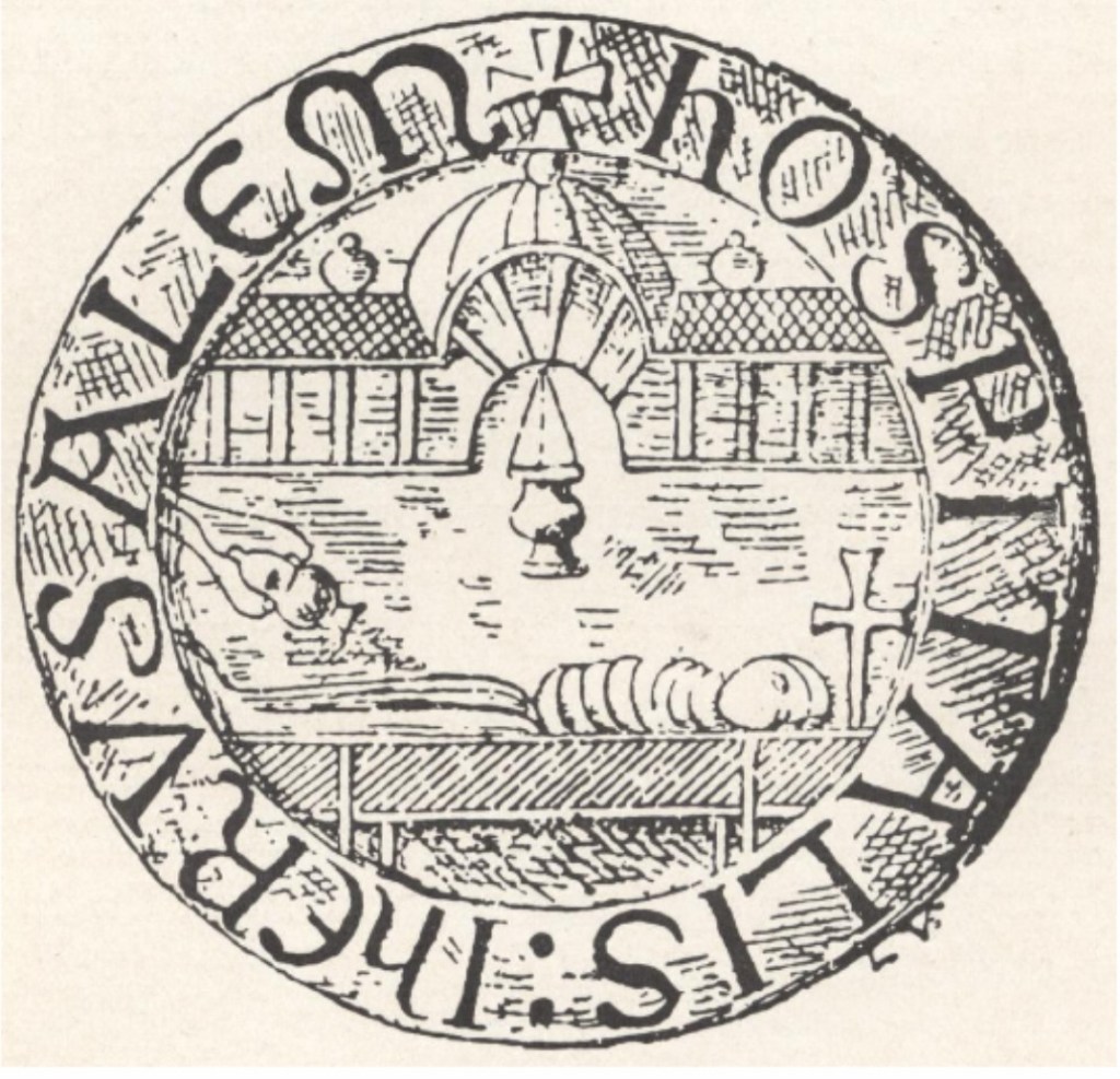 The ancient seal of the Hospital in Jerusalem gives, says Biasiotti, an idea of the appearance of the Church. On the seal we see the figure of a patient lying on a. bed, facing to one side, and in the background a cupola from which is suspended a lamp. A censer hangs near the feet, while at the patient’s head is the cross of the Order. He adds that the design may also represent a funeral within the chapel, and this thought is borne out by the records. The design described is that of the reverse of the Great Seal or the Master’s Bulla.