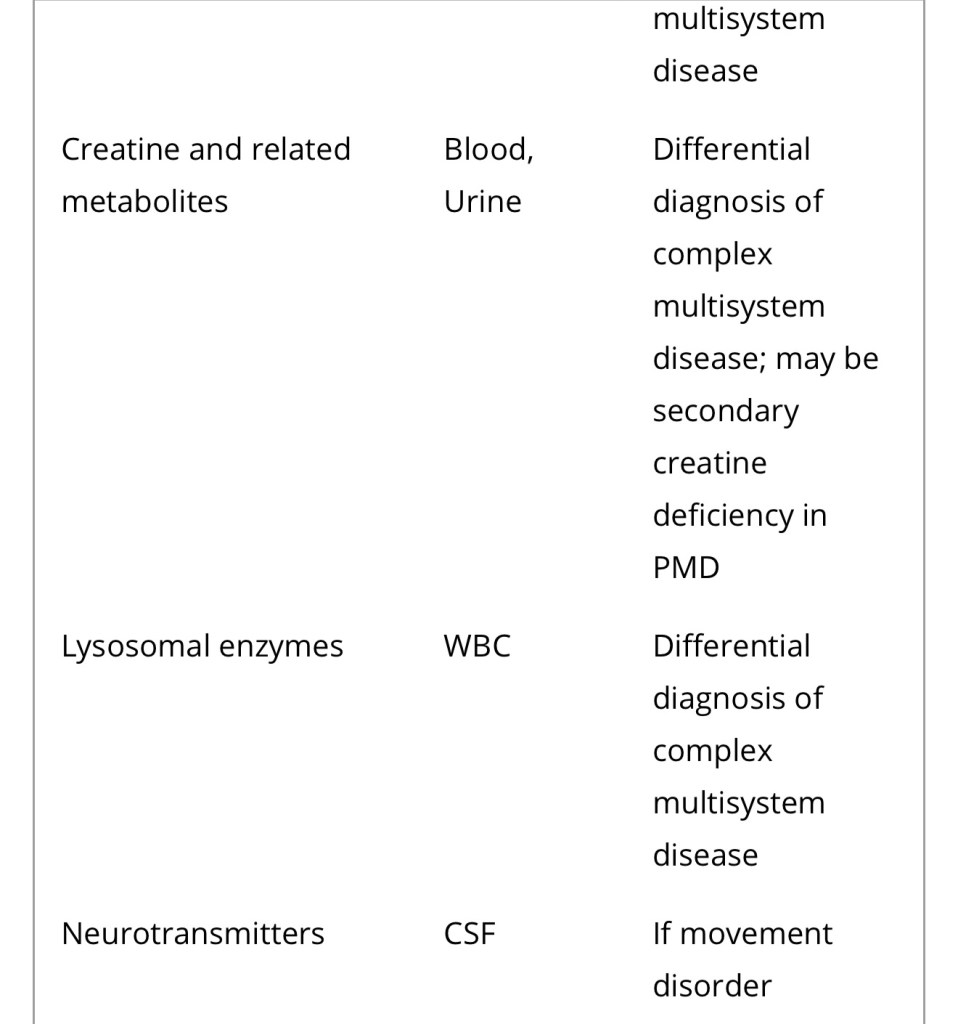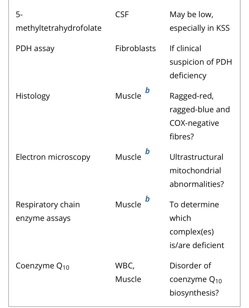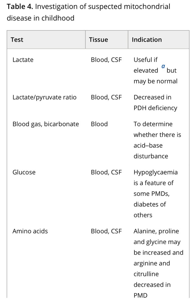 Diagnosis of a mitochondrial disorder requires a multidisciplinary approach, which may include metabolic investigations, neuroimaging, muscle biopsy and genetic testing. Blood, urine and CSF metabolites that can help in the delineation of a specific mitochondrial disorder or in the identification of a nonmitochondrial multisystem disorder (‘phenocopy’) are detailed in Table 4, together with a list of histological investigations and enzyme assays.