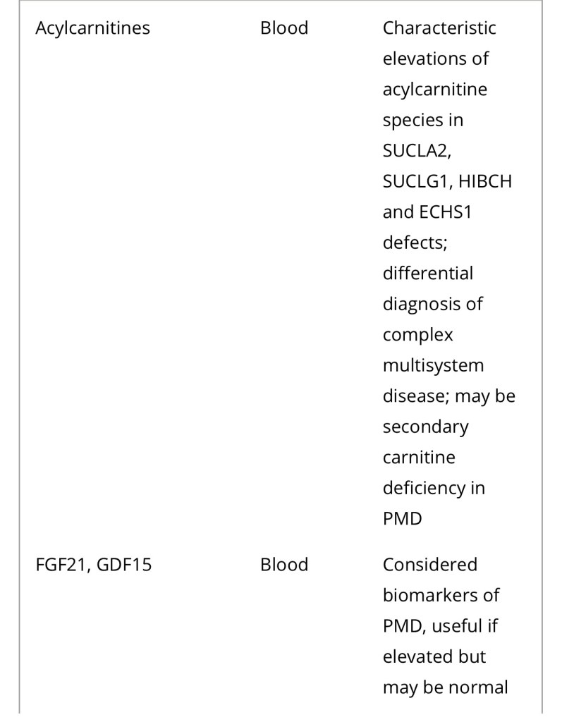 3MGA, 3-methylglutaconic aciduria; COX, cytochrome c oxidase; FGF21, fibroblast growth factor 21; GDF15, growth/differentiation factor 15; KSS, Kearns–Sayre syndrome; MNGIE, mitochondrial neurogastrointestinal encephalopathy; PDH, pyruvate dehydrogenase; PMD, primary mitochondrial disease; WBC, white blood cells.