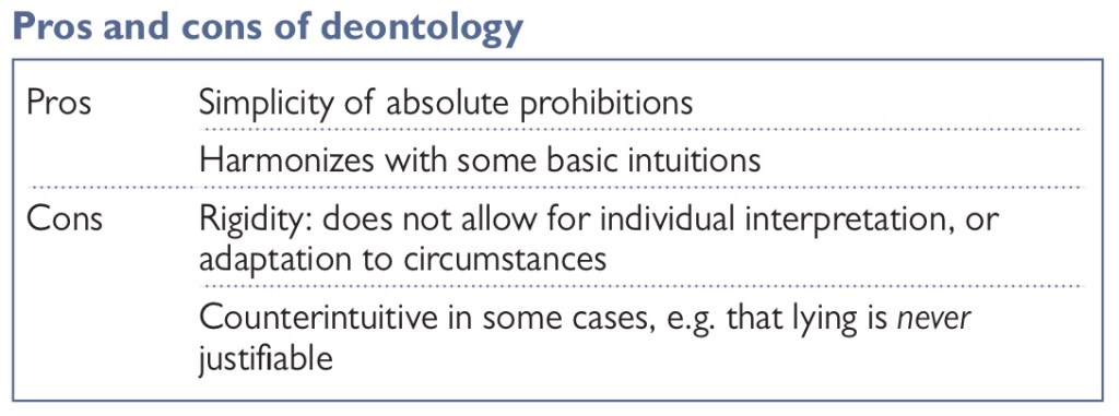 Deontological ethics is typically traced back to Immanuel Kant and is for this reason also called Kantian ethics. Deontology (from Greek deon, meaning ‘duty’) falls within the domain of moral theories that guide choices of what is morally required (leges praeceptiva), forbidden (leges prohibitivae), or permitted (leges permissivae), as a matter of duty, obligation, or responsibility (I use these words interchangeably here). Deontological or Kantian ethics guides choices and defines actions based on the rightness or wrongness of the action in and of itself, rather than defining the rightness or wrongness of an action based on the consequences of said action.