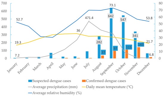 The observed gradual increase in dengue cases from June (n = 5) with a peak in November (n = 143) aligns closely with the seasonal patterns of temperature, relative humidity, and precipitation. The breeding, survival, and biting behaviour of Aedes mosquitoes are directly affected by these environmental factors. In Nepal, the monsoon season typically spans from June to September, characterised by high rainfall and humidity, creating ideal conditions for mosquito proliferation due to the abundance of water sources for breeding [35]. The high number of dengue cases in November (post-monsoon) is likely due to the incubation period of the virus in both the vector and human host [36]. Similar seasonal trends have also been reported in other South Asian countries, where vector density and dengue incidence typically rise post-monsoon [37]. Further, the lack of proper waste management, inadequate public awareness, abundance of discarded tires with stagnant water, and poor sanitation facilities in this area create a favourable breeding environment for vectors. The influence of additional factors, such as urbanisation, increased mobility, and higher adaptability of Aedes spp. on virus dissemination, cannot be ruled out despite the emergence of new serotypes. Bardibas, Mahottari, is a growing town and transit hub of national highways connecting Terai to Kathmandu, the capital city of Nepal [24]. Moreover, due to open borders, Bardibas receives a large influx of people from the neighbouring dengue-endemic state of India (Bihar), which provides ample opportunity for DENV transmission [38]. Therefore, timely interventions of vector control measures before and during the monsoon season can help to mitigate the surge in dengue cases in the region.