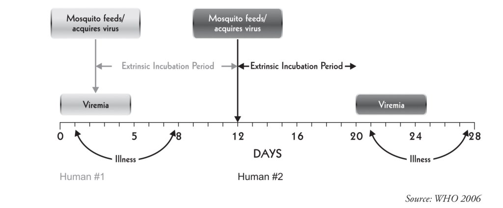 After an extrinsic incubation period of 8 to 10 days, the mosquito becomes infective, and is able to transmit the infection. Once the mosquito becomes infective, it remains so for life.