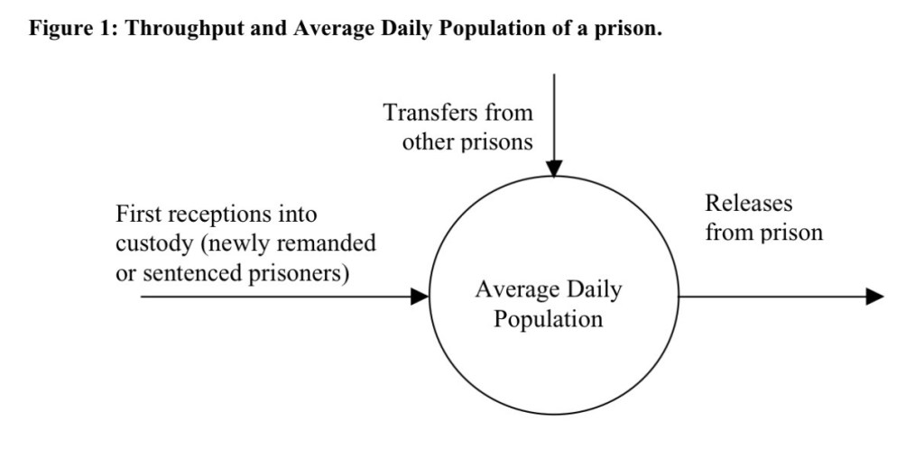 The prison population can be described numerically in a number of ways. The first of these is the Average Daily Population (ADP). This refers to the average number of prisoners in the prison at any one time. The second, New Receptions, refers to the number of new prisoners arriving in the prison in a given time period. In any one prison, the total number of new receptions is made up of newly sentenced or remanded prisoners (referred to as New New Receptions) and prisoners who have been transferred from other prisons.