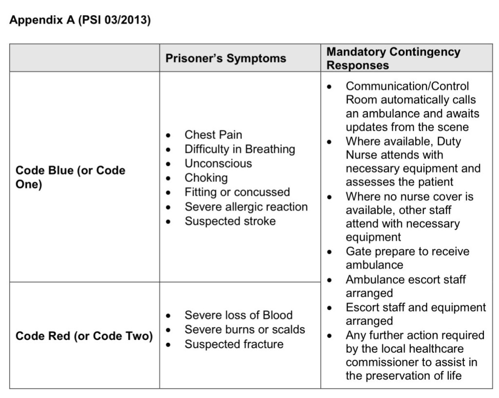 PSI 03/2013, Medical Emergency Response Codes, provides a framework for managing potential medical emergencies. Officers may request the emergency nurse to attend a ‘Code Blue’ (or Code One) or ‘Code Red’ (or Code Two). See Appendix A of PSI 03/2013 (below) for specific clinical presentations and their codes, however simply described, blue means not breathing and red means bleeding.