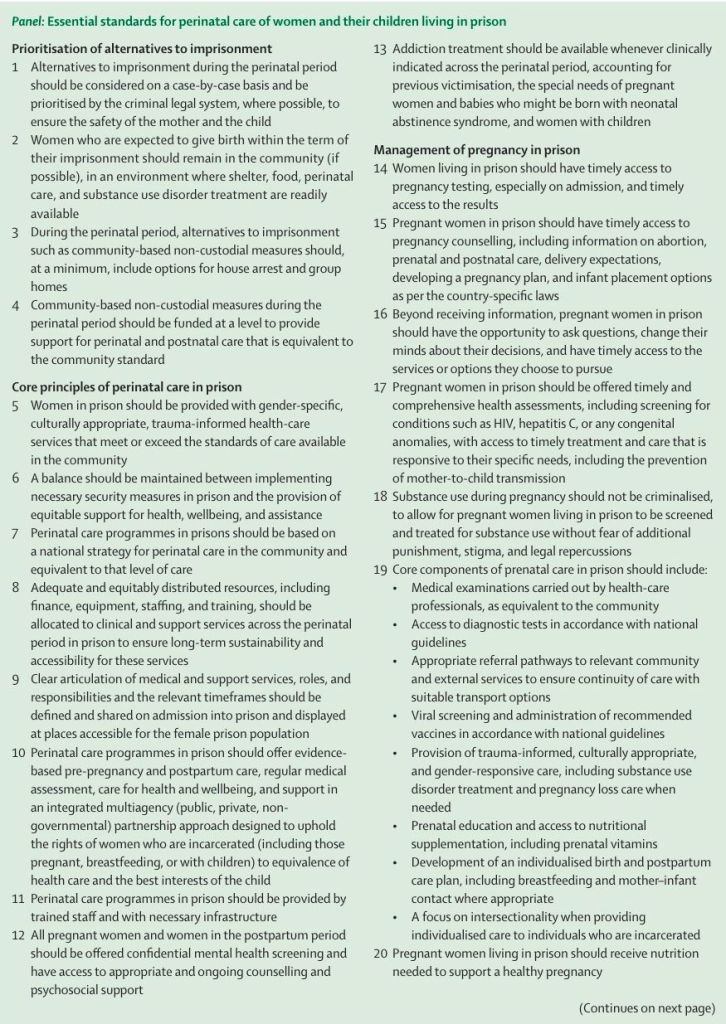 The female prison population continues to rise, with prisons worldwide failing to meet international human rights standards. Many are overcrowded, poorly resourced, and unsafe, especially for women. Women in prison are an obstetric group at high risk, with deficits in perinatal care leading to preventable maternal and child morbidity and mortality. Mother–child imprisonment and mother–child separation can have substantial intergenerational health and social consequences. In this Viewpoint, we present essential standards for perinatal care of women and children who are incarcerated, aligned to human rights obligations, prioritising alternatives to imprisonment, and where custodial sentences are applied, emphasising essential core best practices in prison (inclusion of prisons in national maternal health strategies, resourcing of prison facilities, services, staffing, and medical competencies, comprehensive medical management of pregnancy, obstetric and postpartum care, and release planning). To ensure the rights of women and children in diverse contexts are upheld, standards should be enforced through independent inspections, clinical audits, and integrated public and prison health monitoring of perinatal health outcomes.