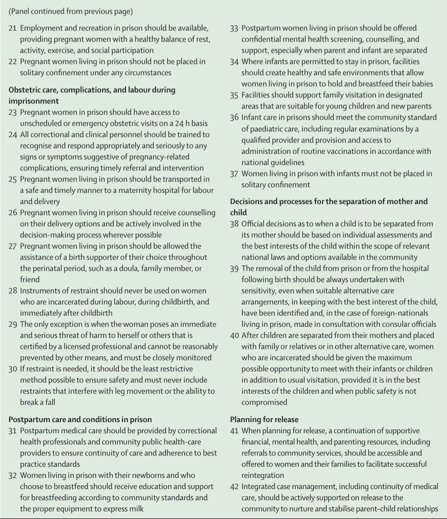 Despite recognised international human rights norms and obligations regarding the treatment of all people who are incarcerated (eg, UN Standard Minimum Rules for the Treatment of Prisoners 19 and UN Rules for the Treatment of Women Prisoners and Non-Custodial Measures for Women Offenders20), many prisons worldwide fail to meet such standards and are overcrowded, poorly resourced, and unsafe, especially for women.1,21,22 National Preventive Mechanisms under the Optional Protocol to the Convention Against Torture and other Cruel, Inhuman and Degrading Treatment or Punishment (OP-CAT)23 and UN treaty body committees routinely document neglect and rights violations concerning the situation and treatment of pregnant women and mothers worldwide who are incarcerated.14